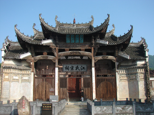 而八座祠堂祠堂现在还剩下三座,它们分别是江氏总祠和两座分祠。江村总祠是江村现存最大的一座宗祠,原为四进两厢两明塘三天井。这座祠堂两次被大火烧毁,又两次重建。宗祠内原有文物无数,仅金匾就有几十块。屏风隔板二十四幅,雕刻着二十四个不同图案的花瓶。