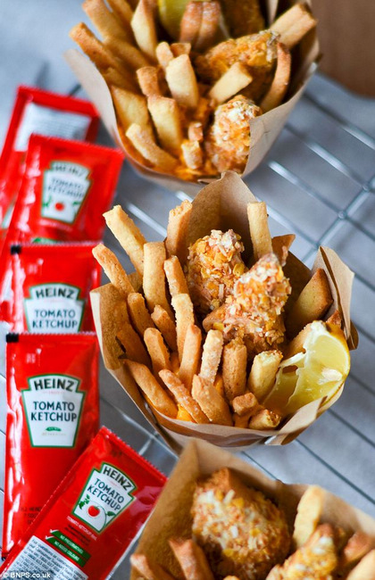 最后,她把这些放在奶油松糕上,并且用棕色的纸包起来,目的是让它酷似真的炸鱼薯条。