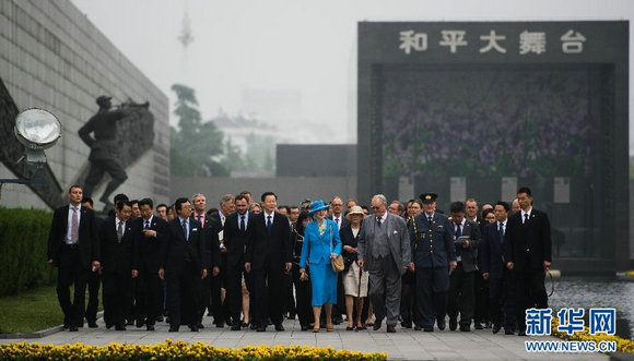 丹麦女王玛格丽特二世于27日参观了侵华日军南京大屠杀遇难同胞纪念馆。这是玛格丽特二世(前中着蓝色外套)走过和平广场。