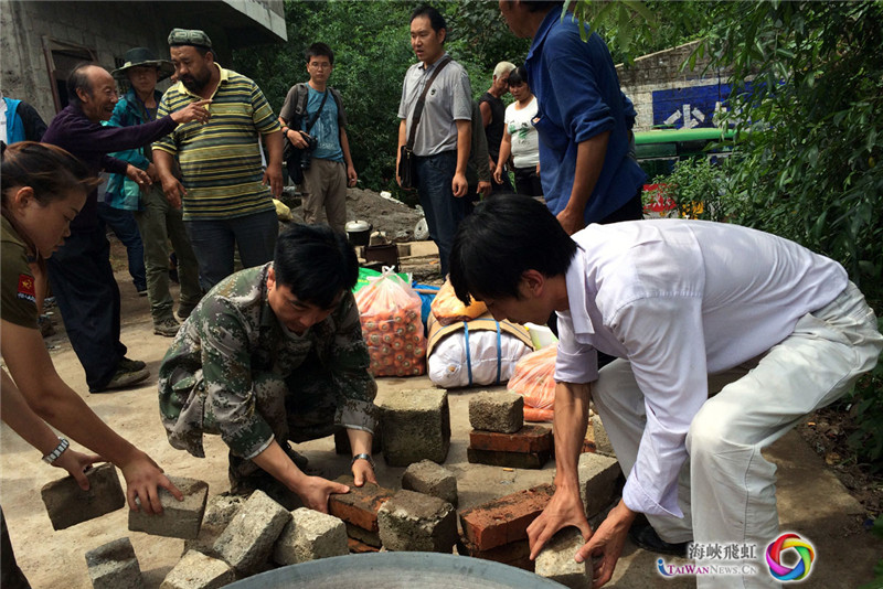 短短几分钟,在一处被震垮的房子旁,一个简易灶搭好了。