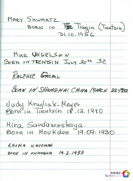拉莎·考夫曼(Rasha Kaufman)1933年出生在上海。说起二战,她为自己当时身在中国感到深深的幸运和感激。拉莎的姐夫出生在波兰,他10岁那年,他父母花了一大笔钱把他和13岁的哥哥送往罗马尼亚躲避大屠杀。“他从此再也没能见到他们。从10岁起,他在这世界上就只有哥哥相依为命了。他们还算幸运,被送上火车,来到了当时的巴勒斯坦,但他的回忆是可怕的。当他再去波兰,一回来他就病了。可是我们从中国回来的时候都高兴得要命,好像刚刚参加完最盛大的聚会。我们是幸运的,非常非常幸运,我们的回忆是那么美好。”