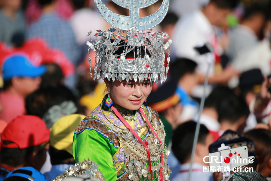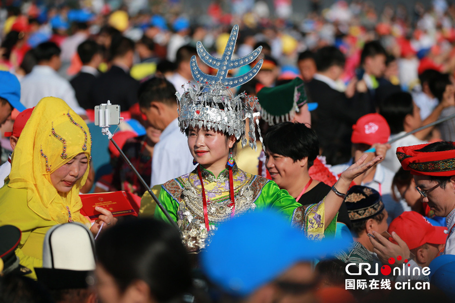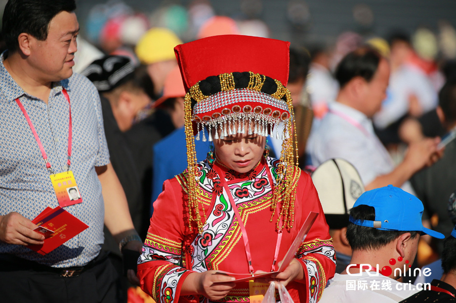 3日,北京天安门广场,少数民族观众盛装到达阅兵现场。