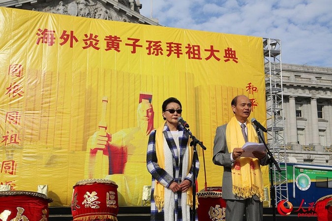 海外炎黄子孙祭祖大典3月19日在美国旧金山市政厅广场举办。中国驻旧金山总领事罗林泉、旧金山湾区侨领方李邦琴致辞。(人民网韩莎莎摄)