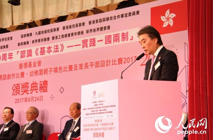 由香港新界校长会、善德基金会主办的“认识基本法—实践‘一国两制’”基本法知识系列比赛,24日完成全部赛事,于新界举行颁奖礼。中央人民政府驻香港特区联络办公室副主任谭铁牛、香港特区政府教育局局长吴克俭、香港中联办新界工作部部长刘林、新界工作部副部长张肖鹰等莅临主礼。