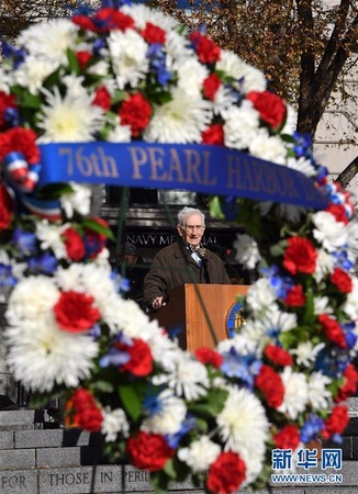 当地时间12月7日,,美国海军举行仪式纪念珍珠港事件76周年。1941年12月7日,日军偷袭夏威夷美国海军基地珍珠港,摧毁、重创多艘美国军舰和上百架飞机。珍珠港偷袭导致美方大约2400人死亡。随后美国对日宣战,揭开太平洋战争的序幕。