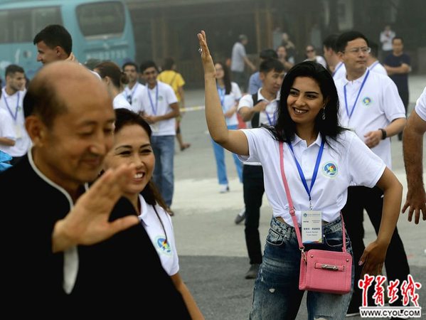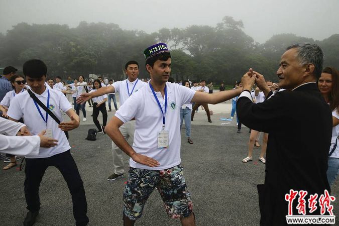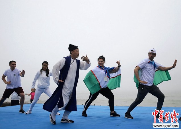 7月16日,山东青岛崂山太清广场,参加第三届“上合组织青年交流营”的各国青年代表学习打太极拳。