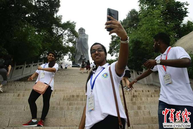 7月16日,山东青岛崂山太清宫,来自印度的青年代表萨卡产,在老子雕像下自拍留念。