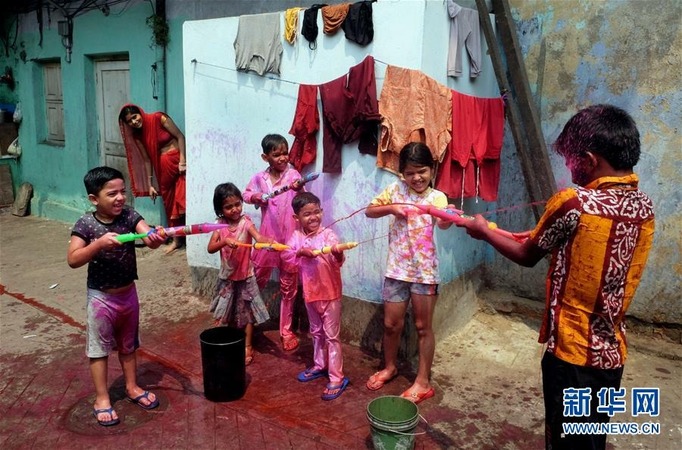 3月28日,儿童们在印度加尔各答庆祝洒红节。新华社发