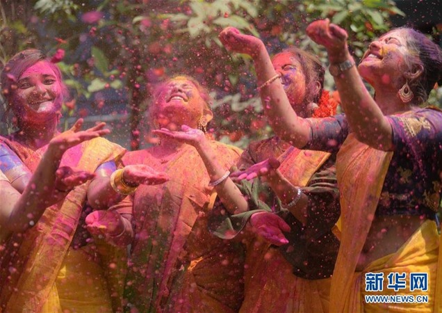 3月28日,在印度特里普拉邦阿加尔塔拉,几名女子参加洒红节庆祝活动。新华社发