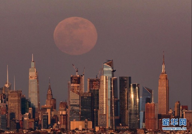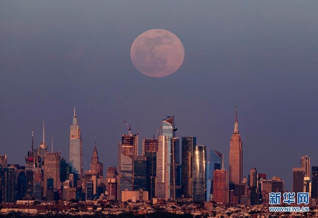 4月26日,“超级月亮”从美国纽约曼哈顿的天际线上升起。新华社记者 王迎 摄