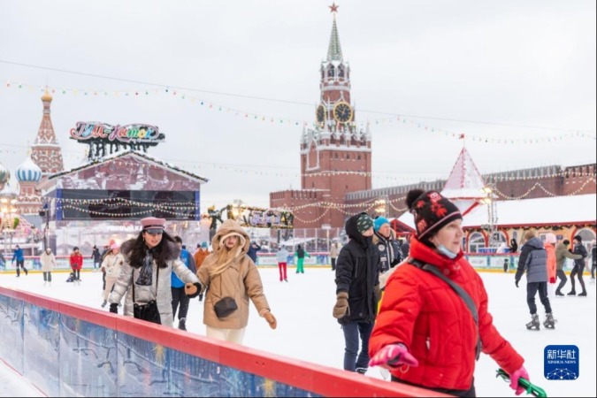 1月26日,人们在俄罗斯首都莫斯科古姆百货商场滑冰场滑冰。新华社记者 白雪骐 摄