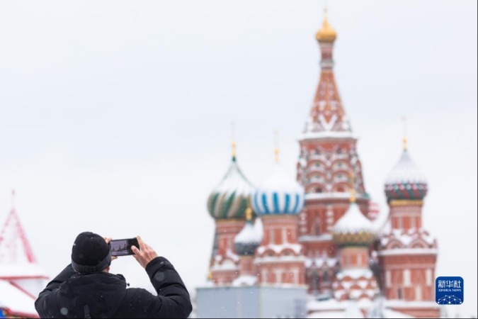 1月26日,一名男子在俄罗斯首都莫斯科红场上拍照。新华社记者 白雪骐 摄