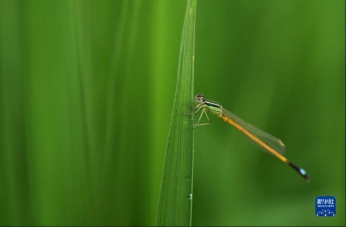 8月18日,在云南省丽江市玉龙县的稻田里,一只豆娘小憩。