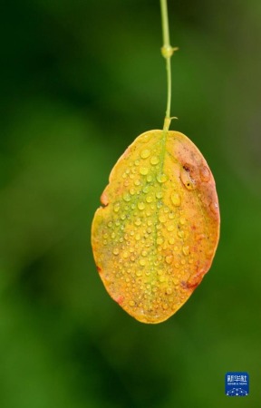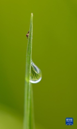 8月17日,在贵州省黔东南苗族侗族自治州丹寨县龙泉镇展良村,稻叶上的露珠映出了即将成熟的稻谷。