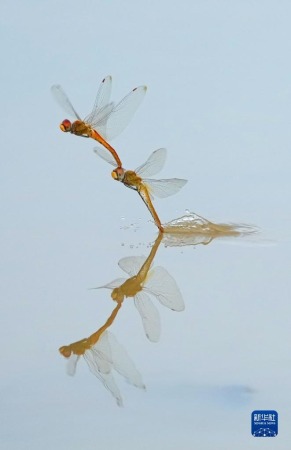 8月13日,在广西南宁市邕宁区蒲庙镇,两只蜻蜓在水塘里点水。