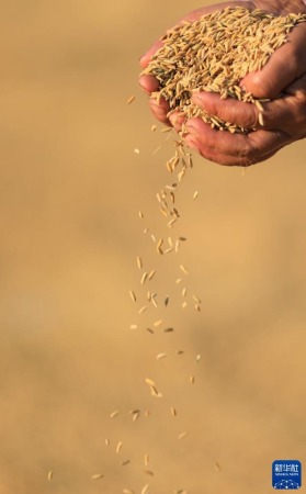 9月1日,在贵州省黔东南苗族侗族自治州从江县刚边壮族乡三联村,村民查看收割后晾晒的谷粒成色。新华社发(罗京来摄)