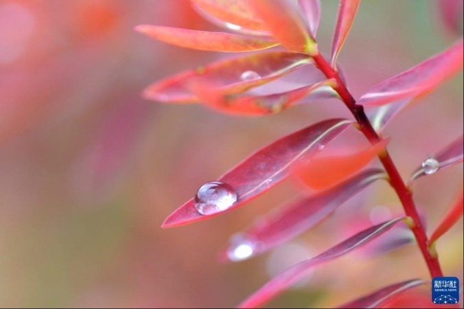 8月30日,在江苏省南京市莲花湖公园,雨后的叶子上挂满水珠。新华社发(方东旭摄)