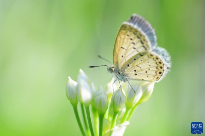 9月2日,在山东枣庄滕州市西岗镇马庙村,一只蝴蝶落在韭菜花上。新华社发(李志军摄)