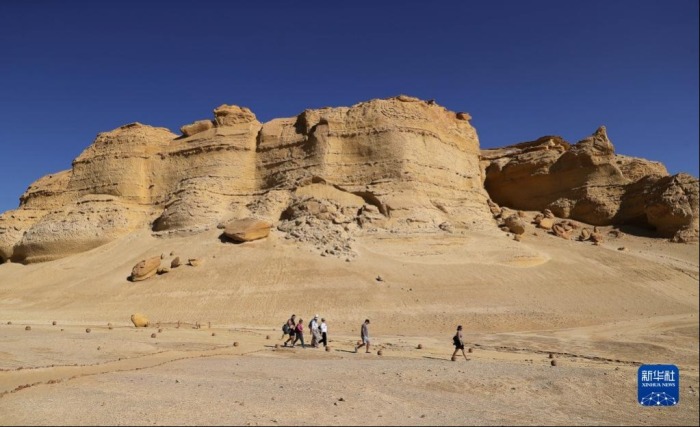 10月29日,游客在埃及法尤姆省参观风蚀地貌。新华社记者 王东震 摄