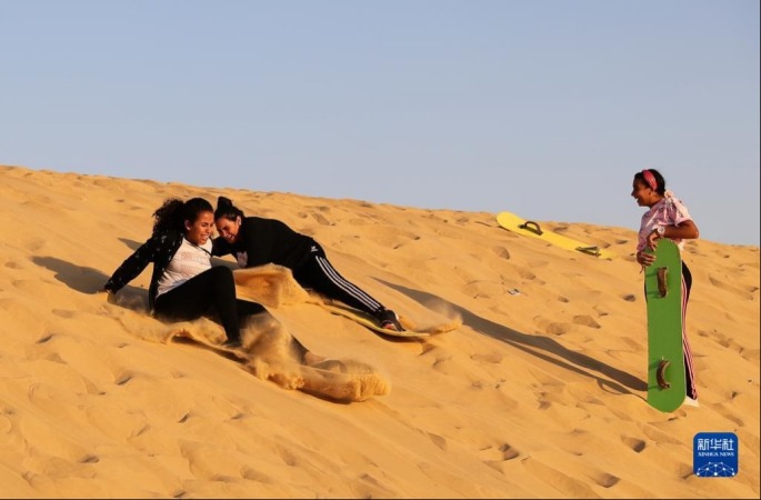 10月29日,游客在埃及法尤姆省的沙漠中玩滑板冲沙。新华社记者 王东震 摄