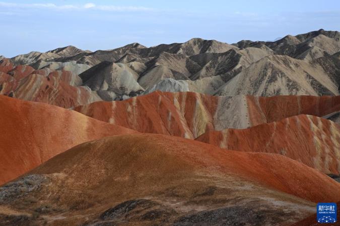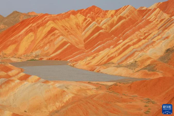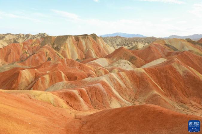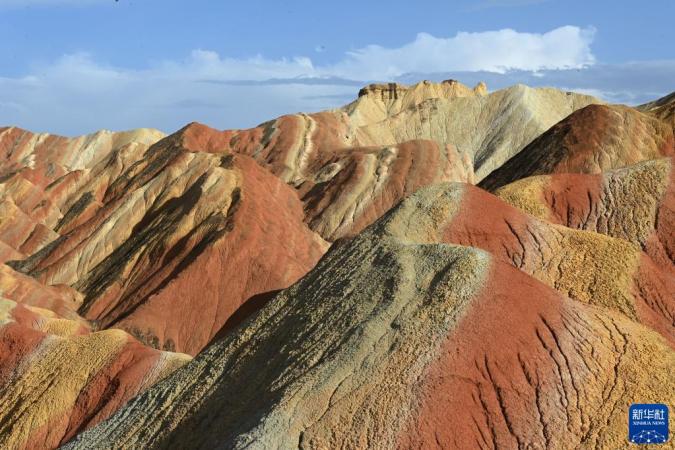盛夏时节,甘肃省张掖市七彩丹霞景区在蓝天白云的映衬下气势磅礴,色彩艳丽。