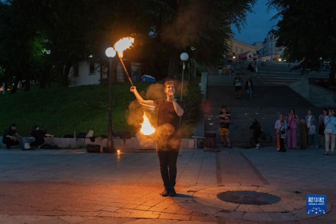 8月16日,一名男子在俄罗斯远东城市符拉迪沃斯托克阿穆尔湾的广场上表演火艺。新华社发(郭飞洲摄)