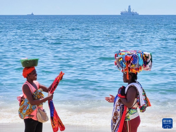3月9日,在安哥拉首都罗安达,两名售卖饰品的商贩在海边交谈。新华社记者 李亚辉 摄
