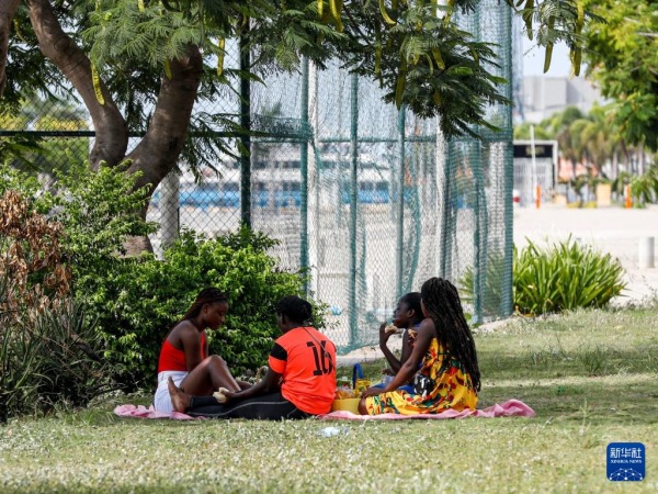 3月9日,在安哥拉首都罗安达,人们在草地上野餐。新华社记者 李亚辉 摄