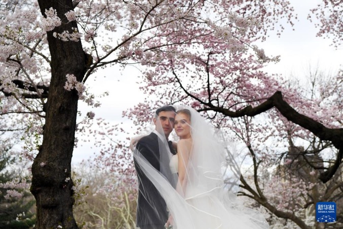 4月6日,一对情侣在美国纽约中央公园的樱花下拍摄婚纱照。新华社记者 李睿 摄