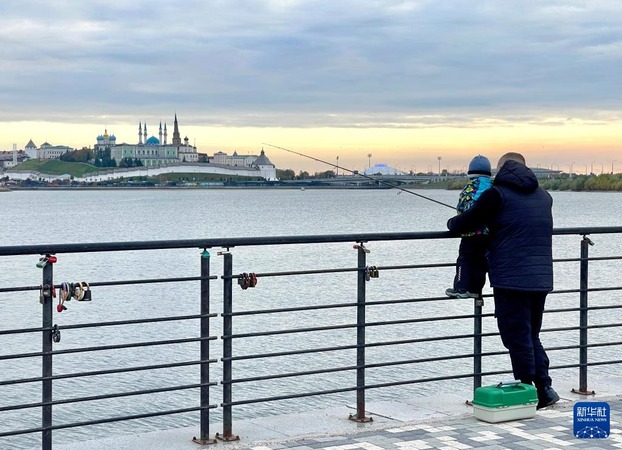 10月20日,在俄罗斯喀山“家庭中心”外,一名男子抱着孩子在河畔钓鱼。新华社记者 翟健岚 摄