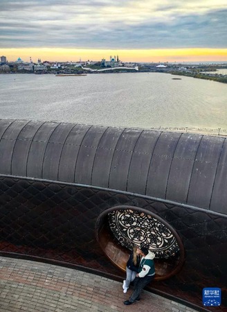 10月20日,一对情侣在俄罗斯喀山“家庭中心”观光平台留影。新华社记者 申宏 摄