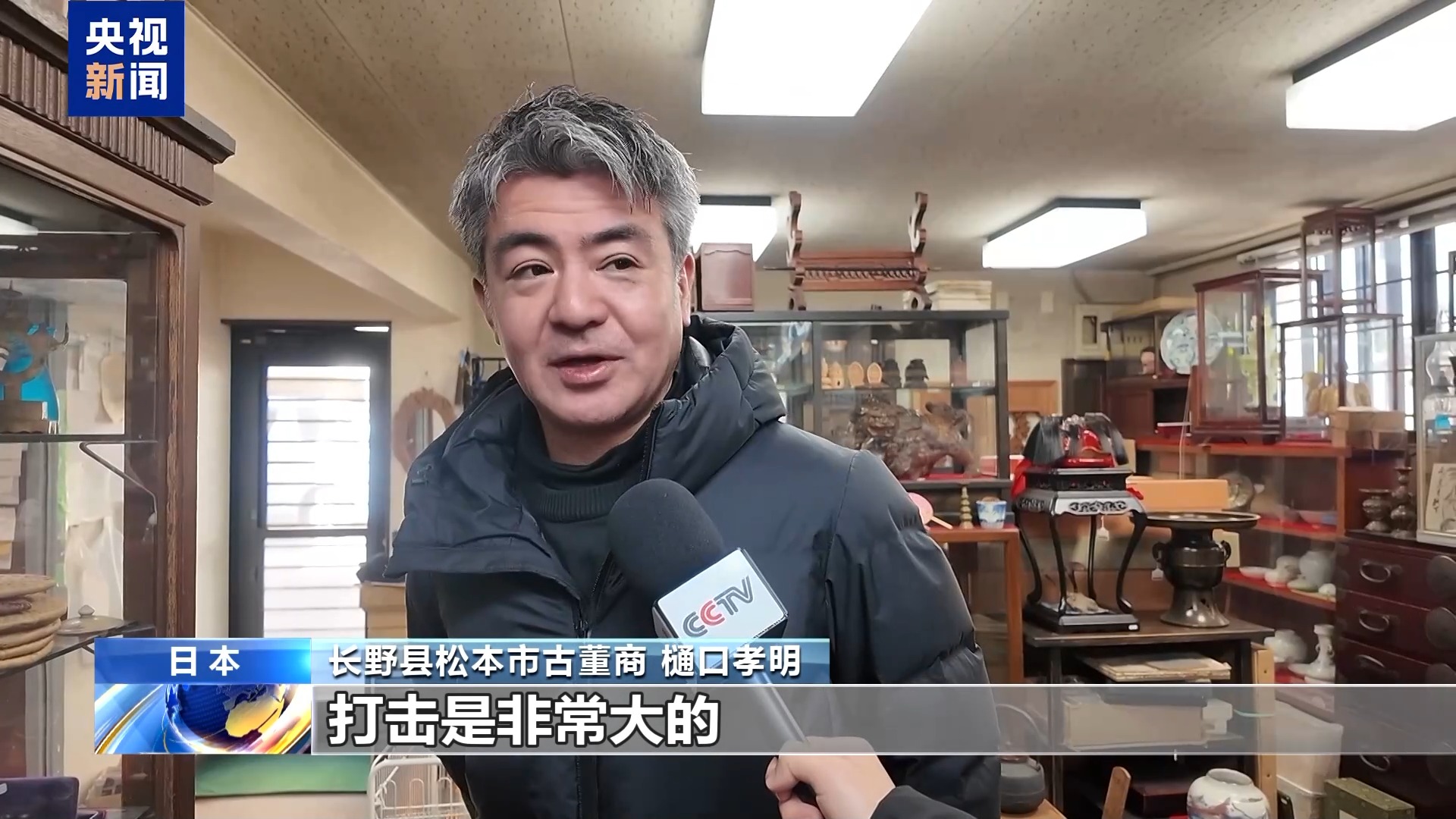 长野县松本市古董商 樋口孝明:以前(中国游客)很多,现在减少了很多,来我们店的中国客人本来很多,(现在中国游客不来)对我们还是会有影响,所以中国人不来,或者不在日本购买,这种情况对我们做古董生意这个行业来说,打击是非常大的。