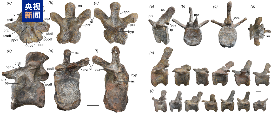 △祥云龙的后部背椎(左)和尾椎(右),比例尺为10cm
